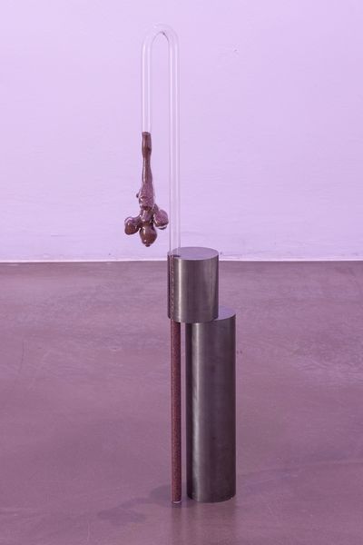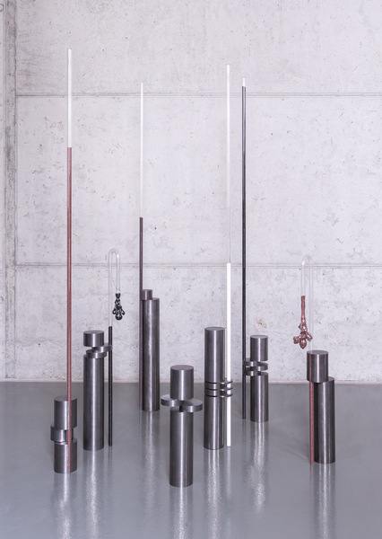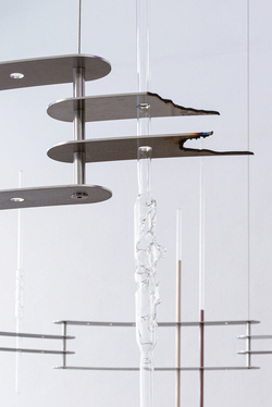 “Within Constellations” ist eine begehbare, schwebende Raum-Assemblage: Eine Metallkonstruktion trägt mundgeblasene Borosilikatglas-Röhren, die mit verschiedenen Sanden gefüllt sind – industrielle Silikate, wie sie in der Sandstrahltechnik zur abrasiven Bearbeitung von Oberflächen eingesetzt werden. Die Installation inszeniert ein aufgebrochenes System, das zwischen technischer Funktion, geologischer Materialität und archäologischer Spur oszilliert. Diese Prozesse verknüpfen sich mit übergeordneten Fragestellungen zum Umgang und der Bewertung von Materie, Energie, Transformation, Kategorisierung und Umordnung – aber auch zu Zyklen von Zerfall und Erneuerung. In diesen Materialien verdichtet sich für mich auch ein Archiv traumatischer Prozesse – nicht im Sinne dokumentierter Fakten, sondern als verletzungsoffene Oberflächen, auf denen sich Kontakt, Energie, Spannung und Abwesenheit niederschlagen.